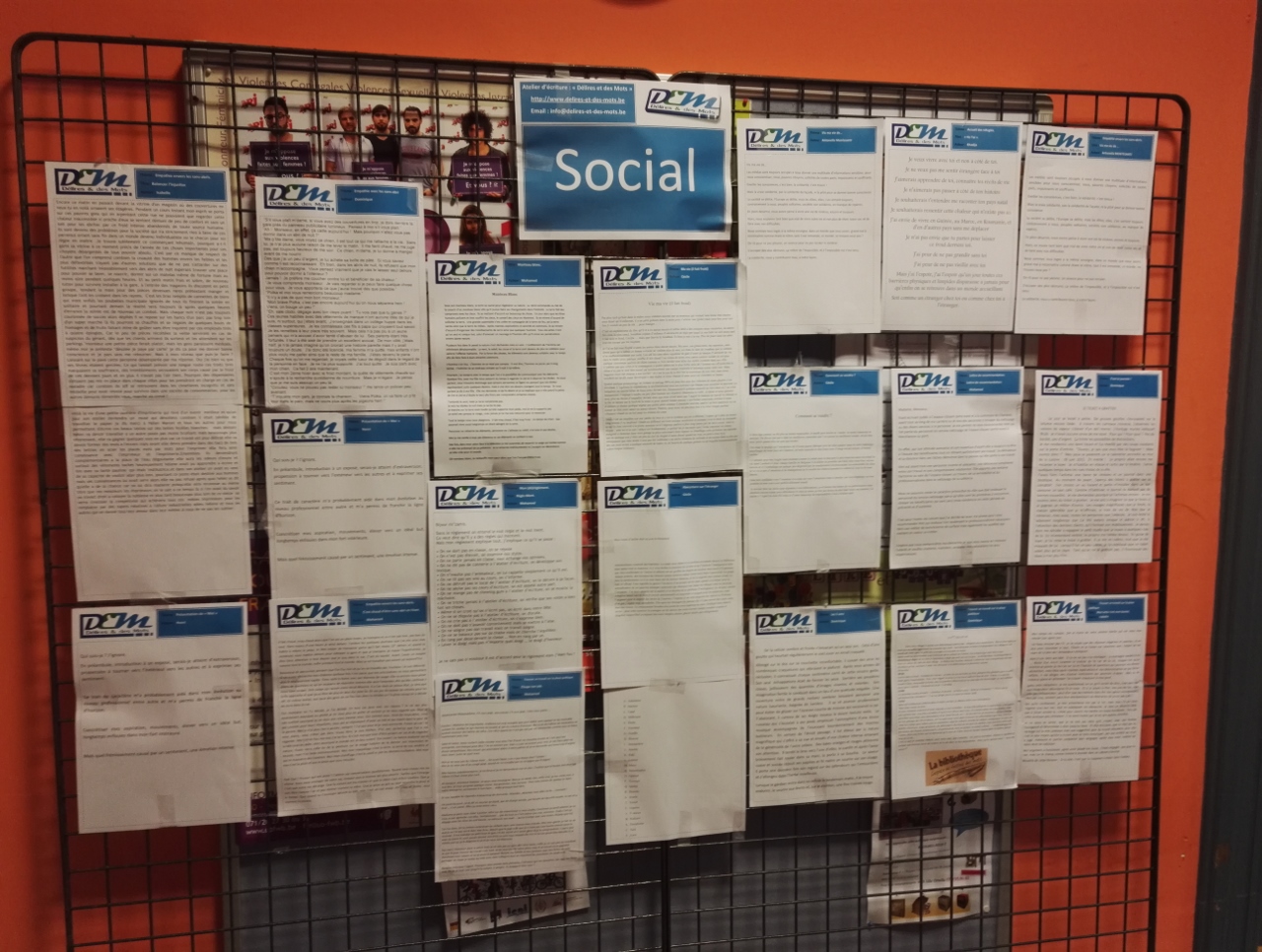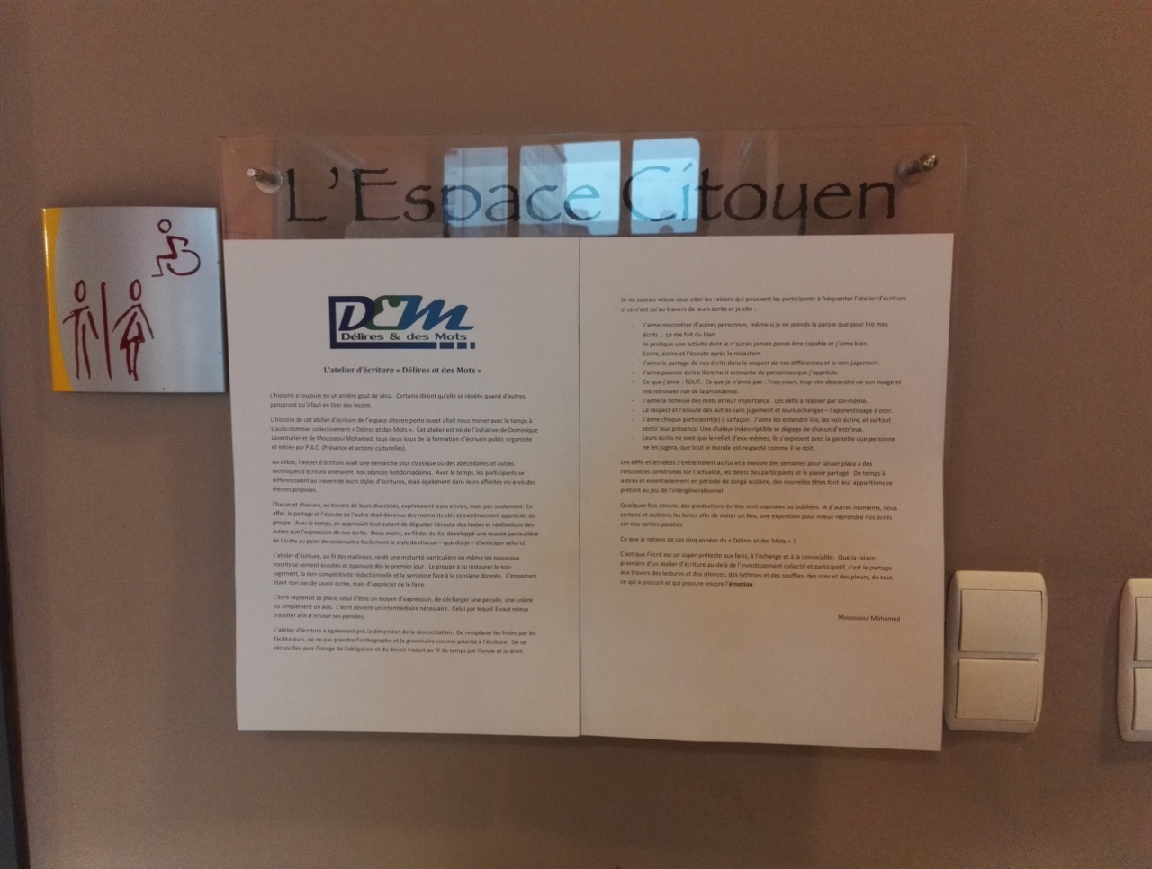 Afin de fêter les cinq ans de l’atelier d’écriture « Délires et des mots », les participants, ainsi que l’animateur, exposent leurs écrits et organisent le vernissage le lundi 29 février 2016 à 15h00.